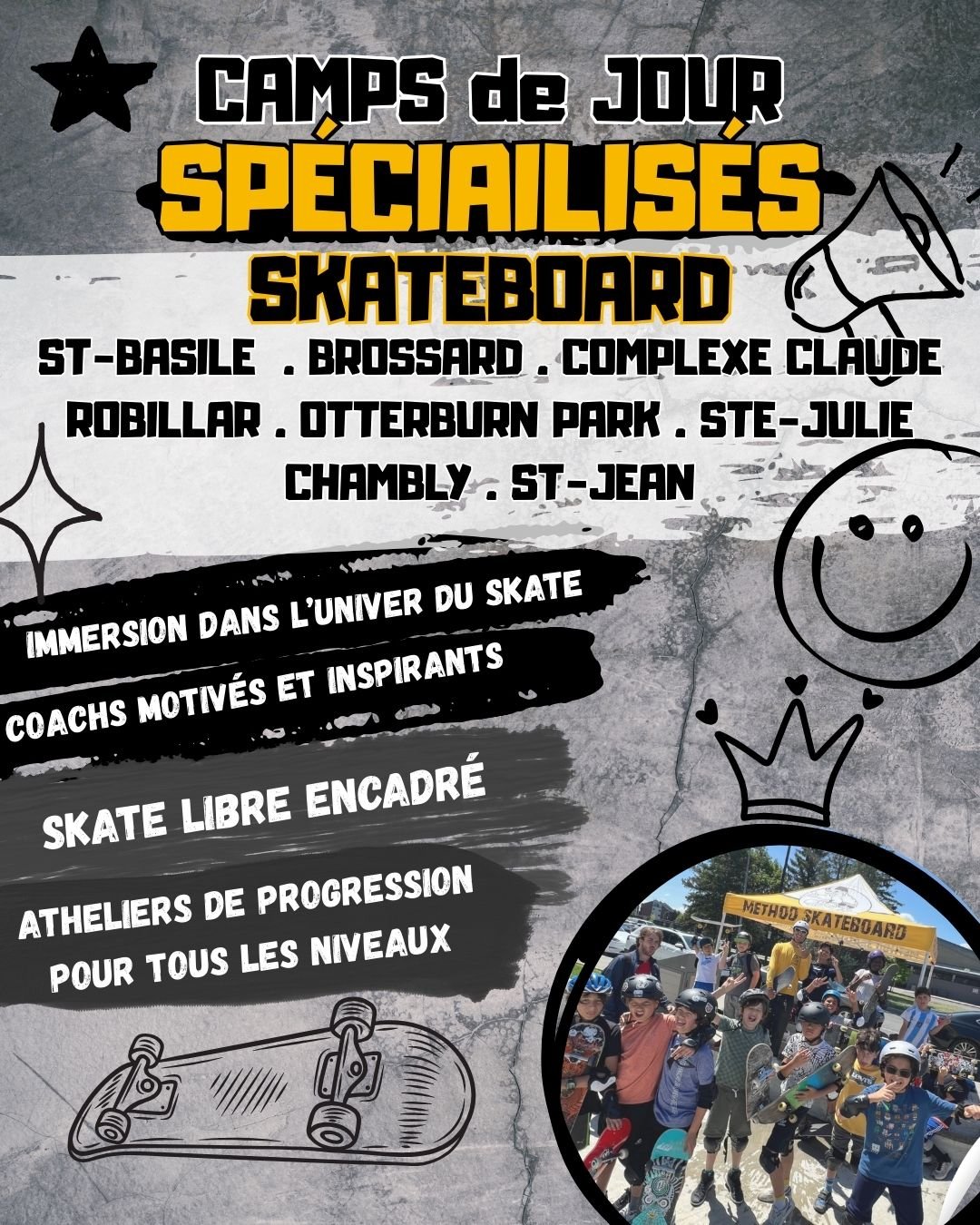 Nos camps spécialisés sont conçus pour tous les niveaux, du débutant au skateur avancé. Offerts en demi-journée en collaboration avec différentes villes, ces camps permettent aux jeunes de s’initier ou de perfectionner leur technique dans un cadre structuré et motivant.